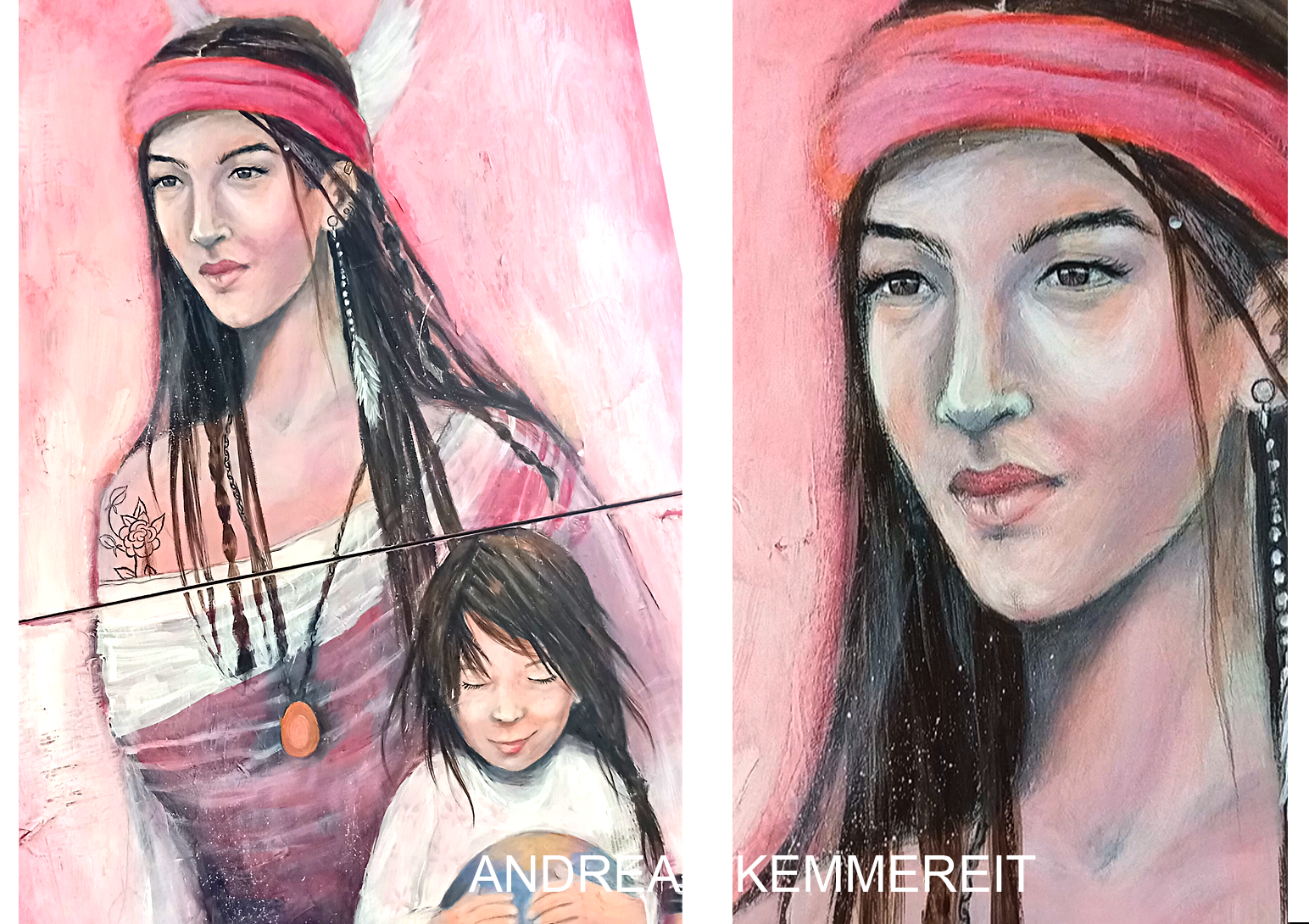 Sehr gerne male ich innere Seelenbilder. Die “indianisch” anmutende Frau und ihre kleine Tochter symbolisieren einen starken Entwicklungsschritt. Während die Erwachsene weise in die Zukunft schaut, spielt das Kind noch mit der Weltkugel. Das Bild ist 2017 nach einem großen Umzug entstanden. Eine Weiterarbeit fand danach immer wieder in Details statt. Andrea Kemmereit